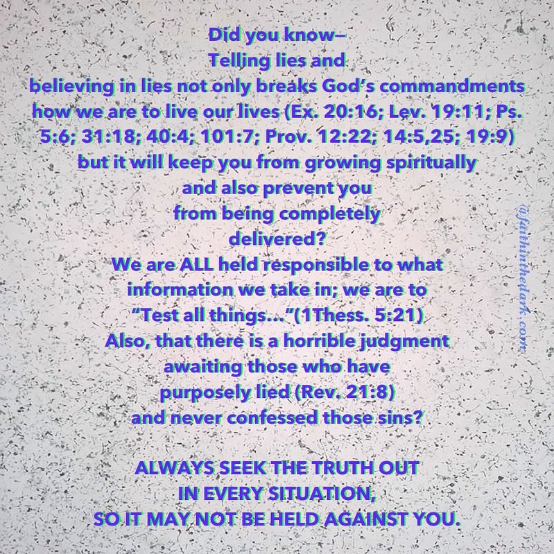 If from time to time, we unfortunately ignorantly believed people who lied to us, and/or passed that lie onto others, we should always confess those sins as well, but instead of just giving the benefit of the doubt to people when they tell us something that should have been checked out further, we should “test all things” and be that Berean (Acts 17:11) the Scriptures tell us to be, so we can know the truth (Jn. 8:32) about certain questionable topics or situations.