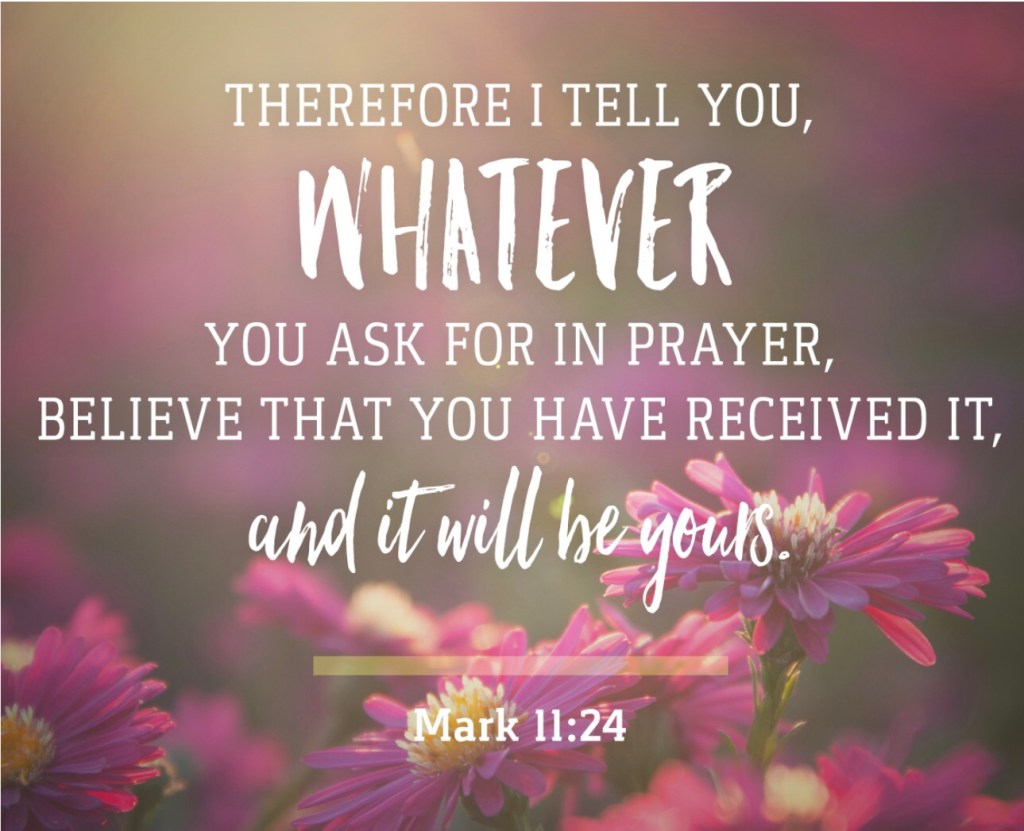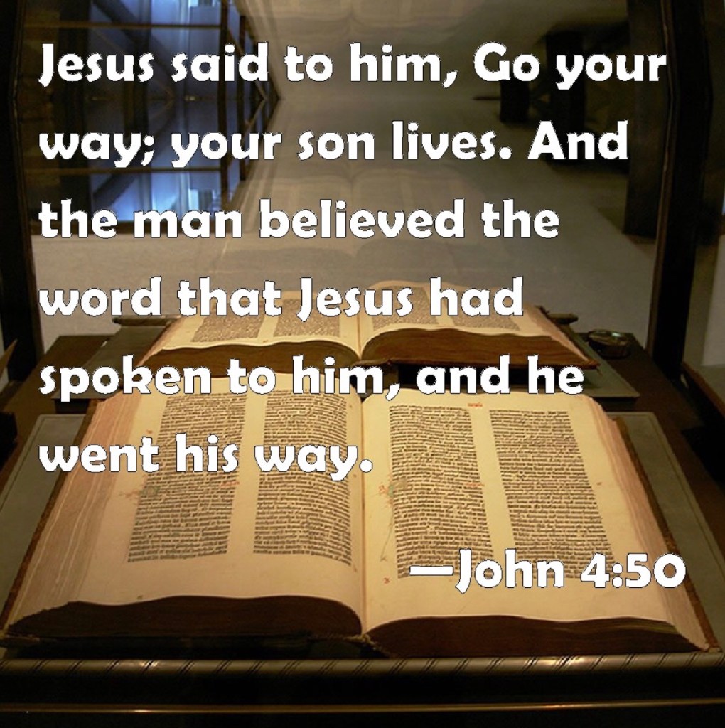 So here are the verses that “shine” for me, and gave me the boost of confidence, assurance and encouragement needed–the passages they used came from Mark 11:24: “When you pray, BELIEVE”, and also John 4:50: “Jesus said unto him, ‘Go your way; your son lives.’ And the man BELIEVED the word that Jesus had spoken unto him, and he went his way.”