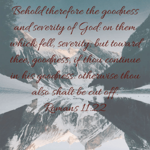 I came across a Bible verse this past week that struck me; it was from Romans 11:22–“Behold therefore the GOODNESS and SEVERITY of GOD…” It’s in the pic so I won’t repeat it here. When I sat there and read it over a couple of times, it really got to me how BLUNT the Lord God is. They are strong but truthful words. The Lord God HAS to “tell it like it is” sometimes, to “get the message across” to His VERY stubborn, stiff-necked Creation. Even I, a Daughter of His, acts like a BRAT sometimes😫, and I find myself more ofthen than not these days, having to apologize🥺 for my attitude and not being grateful enough.