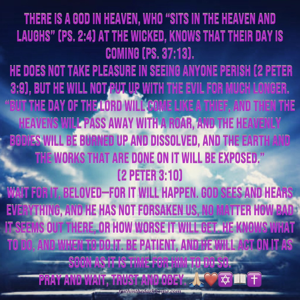 This message is both a warning to those who continue to do evil, to STOP NOW, and for those who wait on the LORD—get ready, for He has NOT forsaken you! Keep your lamps trimmed with oil, and your minds focused on Him. Continue to PRAY for the the lost, and hope, for the best IS yet to come for all those who have waited upon the LORD.